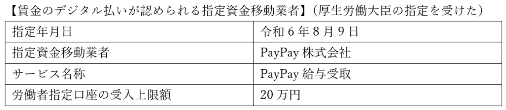 令和6年8月9日、「PayPay株式会社」に対し、労働基準法施行規則第7条の2第1項第3号の規定に基づき、資金移動業者の口座への賃金支払いに関する厚生労働大臣の指定が行われました。
